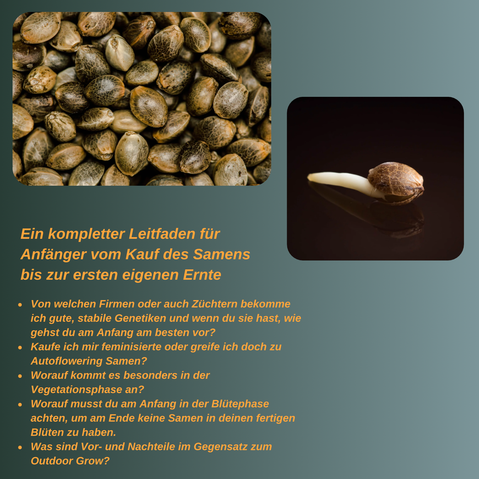 Wir gehen mit Euch die Themen Samen und Sämlinge, Stecklinge, Vegetationsphase, Blütephase, Ernte und Trocknung durch. Und vieles mehr.